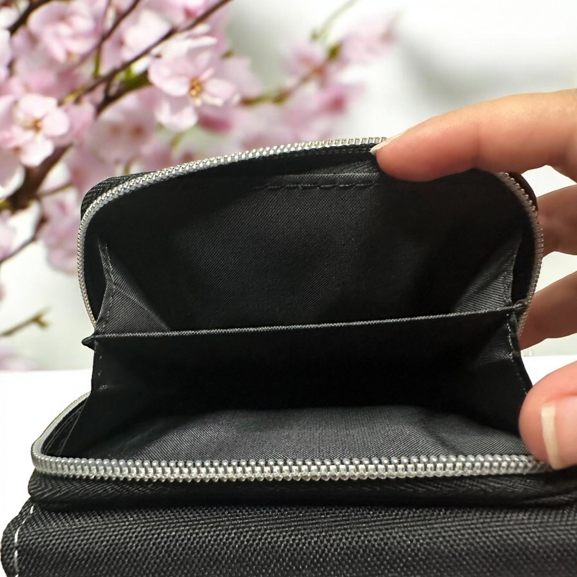 Portefeuille noir en tissu avec impression à l’avant
